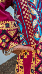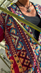 The fabrics come from recycled Gujarati festival skirts, richly embroidered in kaleidoscopic patterns, then passed on to tailors for upcycling after their seasons of festivity.